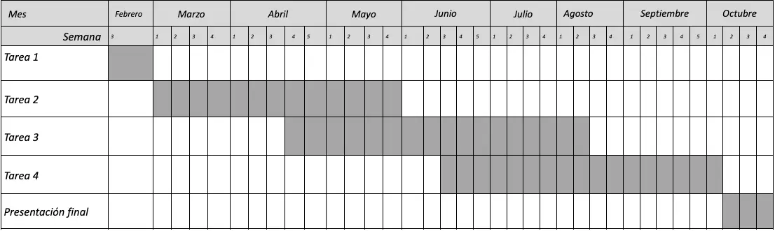 Diagrama de Gantt por semana de acuerdo con las tareas especificadas en el punto f y especificando entregas parciales y entregas finales de los productos.